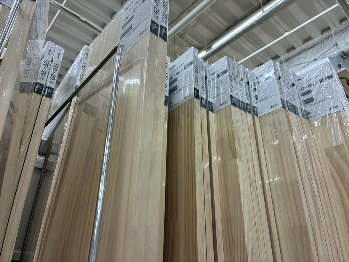 素材選びは非常に重要です。本来は無垢材の質感を楽しみたかったのですが、コスト面と、加工ミスをした際にすぐ買いに走れる「入手性」を重視し、ホームセンターで定番の「パイン集成材」を選択しました。