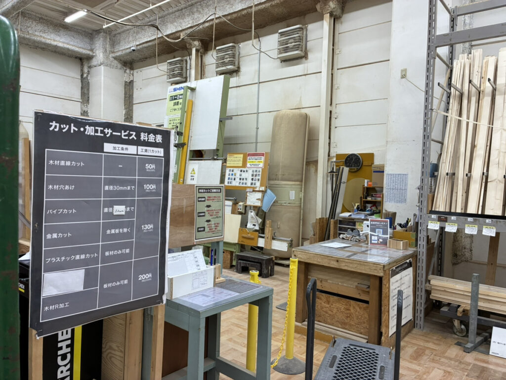 大きな板を正確に切るのは大変なので、ホームセンターの「カットサービス」をフル活用しました。1カット数十円で、プロがミリ単位で切ってくれます。余った端材も引き取ってもらえるので、ゴミも出ません。