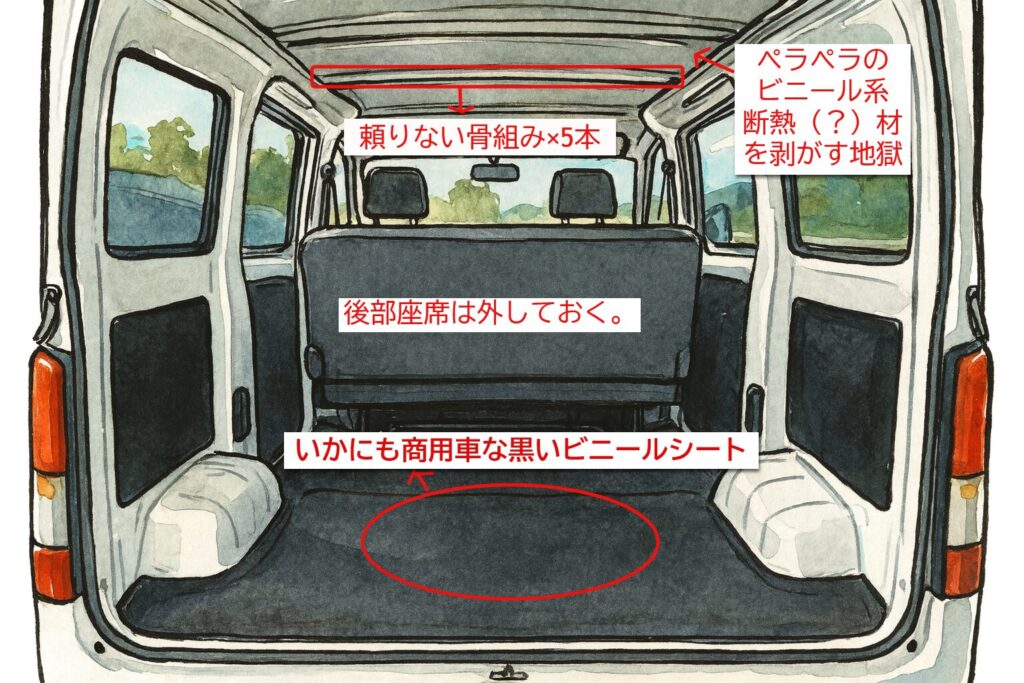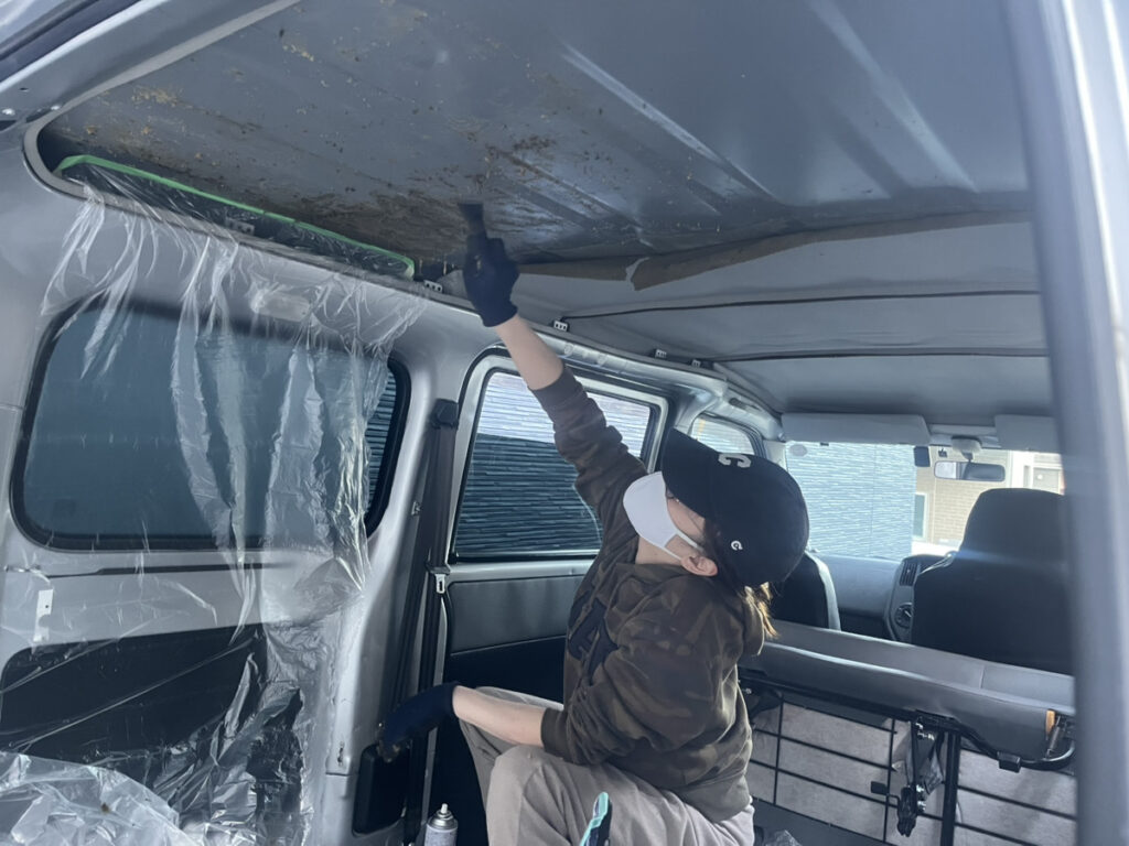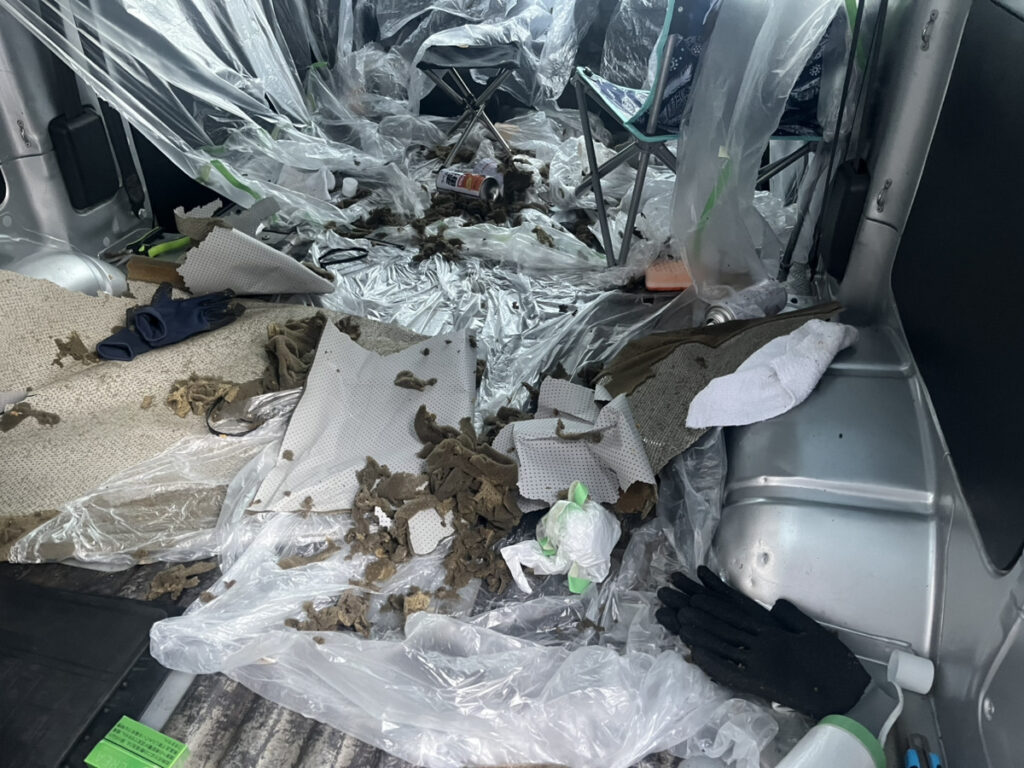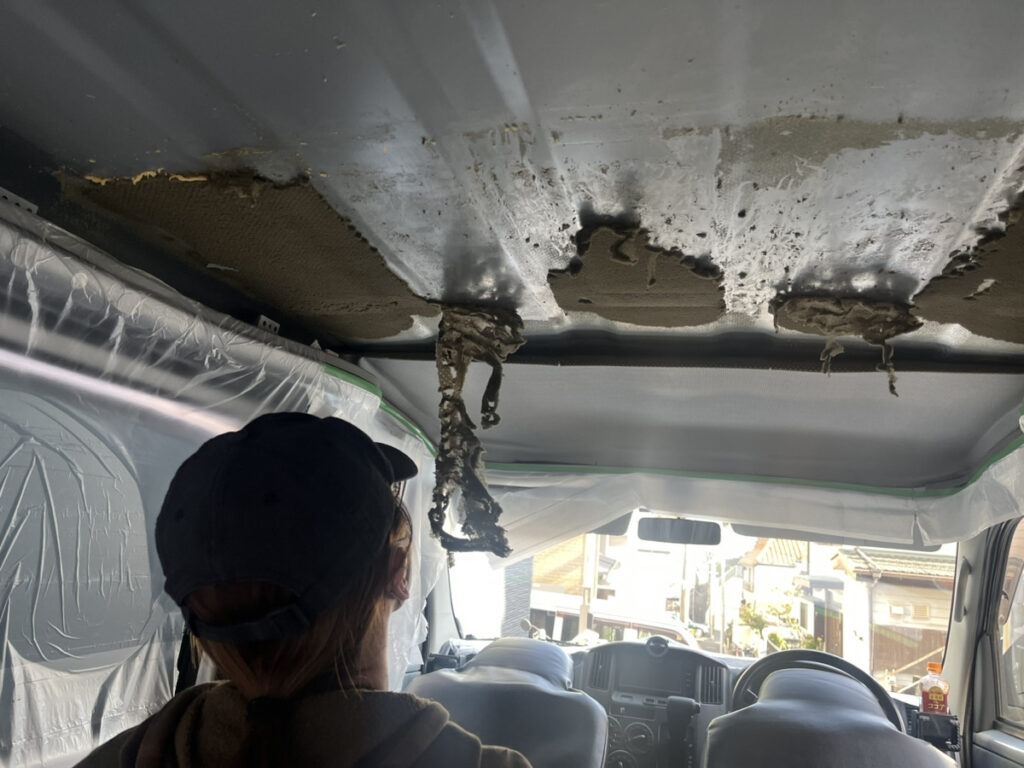 デッドニング・断熱作業の最初の難関は、車内をまっさらな状態にすること。特に、天井のクッションを剥がす作業は、僕たちの車中泊DIYで最大の難所でした。