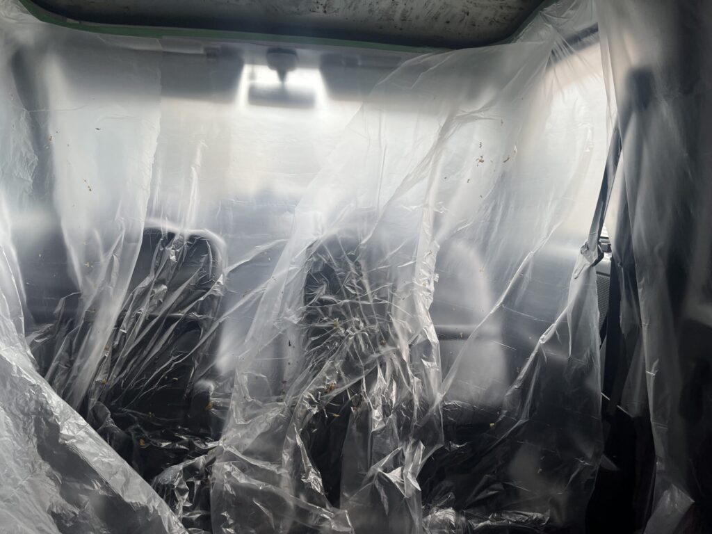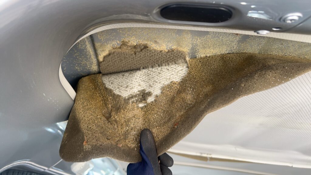 作業後は写真のように、風神が染み込んだスポンジのカスが大量に車内に散乱しました。前述していますが、初日は甘く見てちょっとしか養生しませんでしたが、後悔して後にがっつり処理しました。