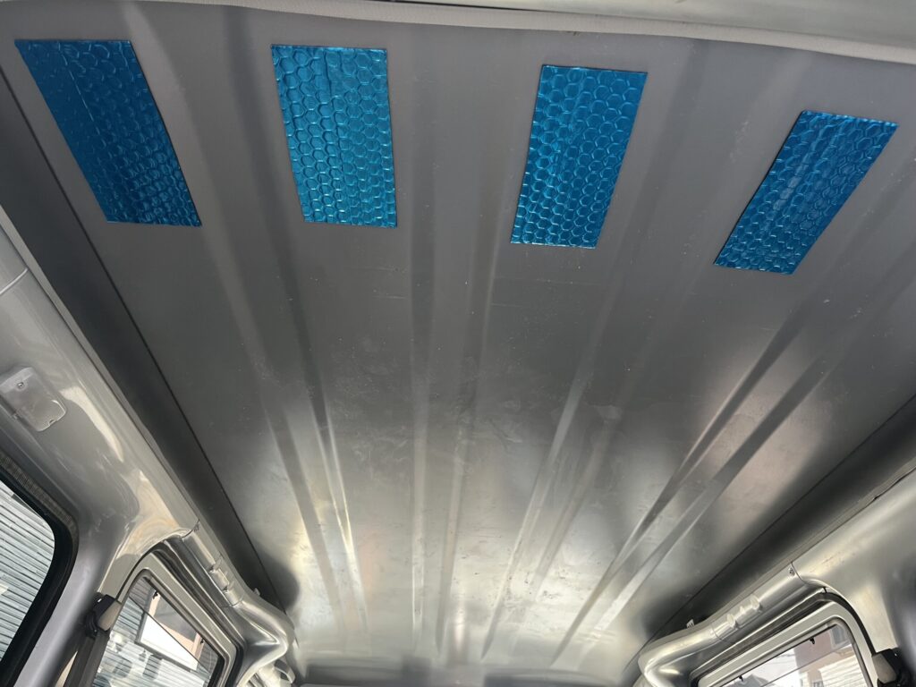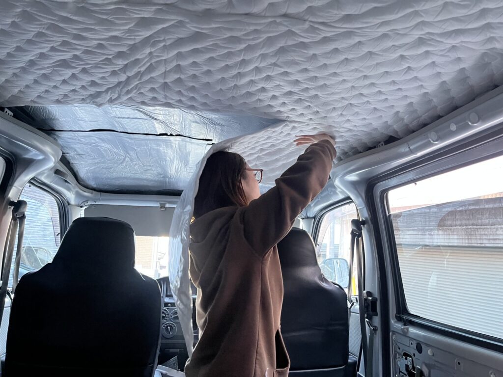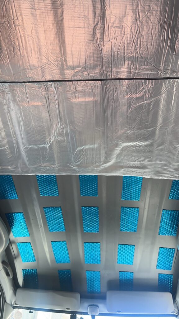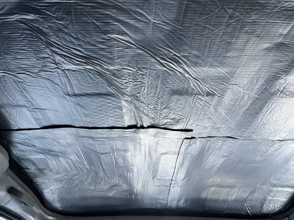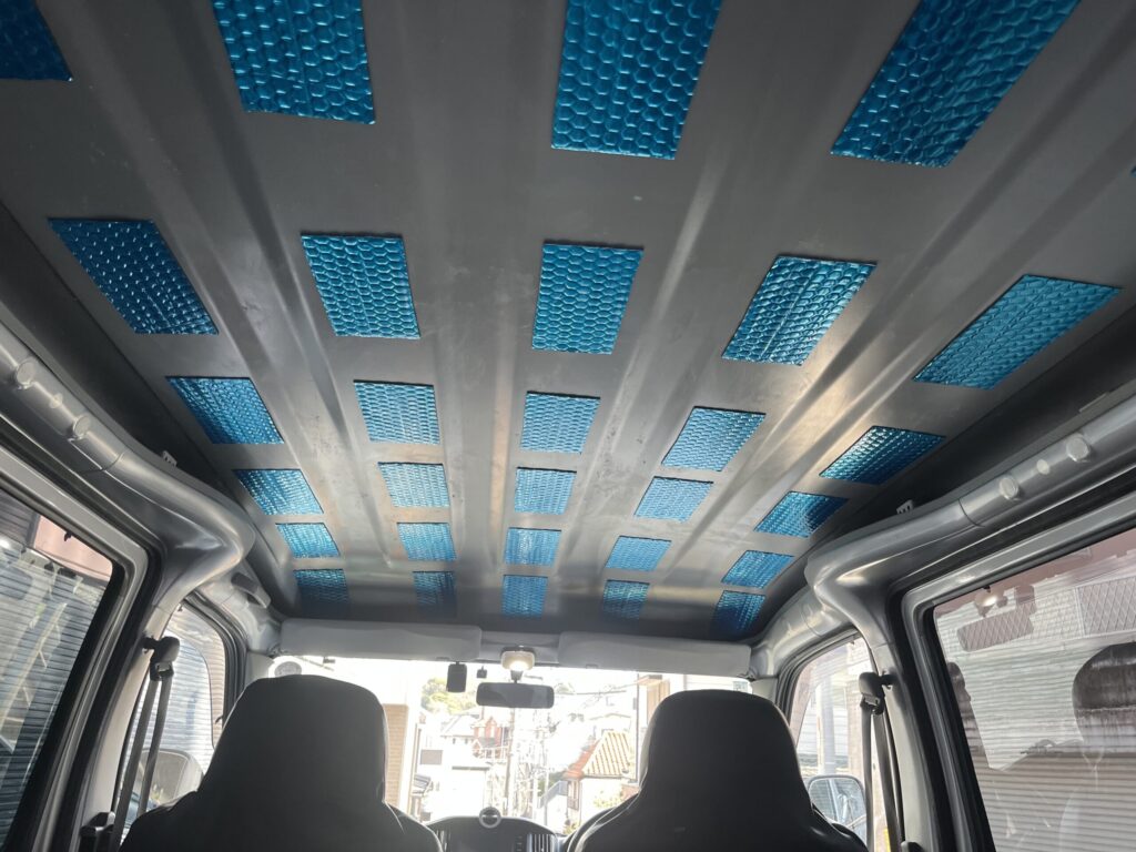 (シートではなくホームセンター等で安価に手に入るスタイロフォームで行う方もいますが、タウンエースは天井が低いこともあって、厚みの問題でスタイロフォームは使いませんでした)