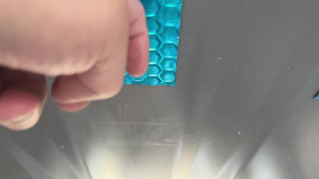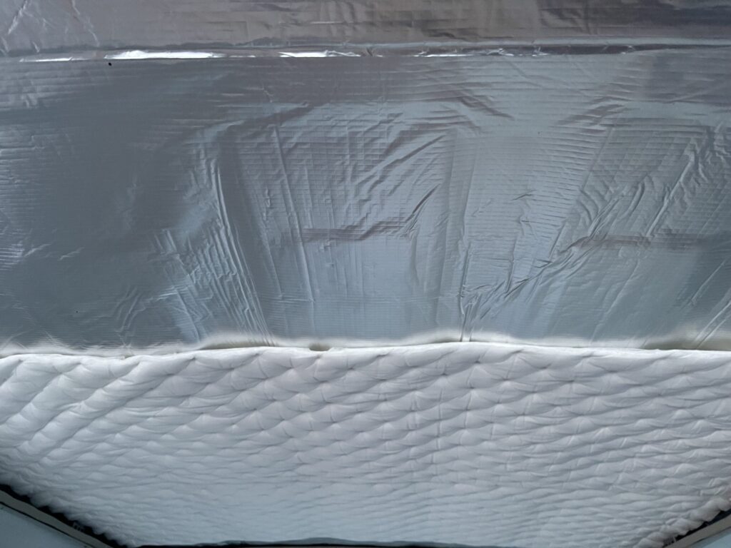 続いて、断熱シートの貼り付けです。 天井の断熱材は、1層目に写真のような感じでアルミ断熱シートを貼っています。
