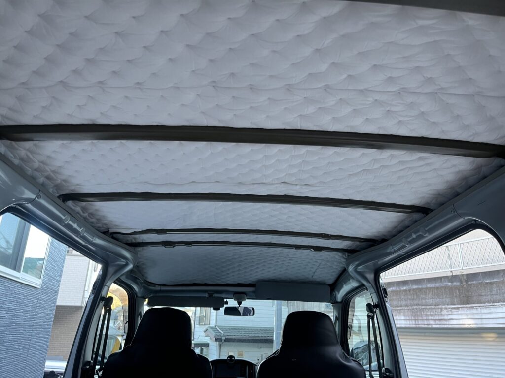 僕たちのタウンエースはS402Mですが、それ以降のモデルは、天井にカバーがあって、その中に骨組みとウレタンフォームっぽい断熱材が簡単に貼ってある構造が多いようで、Youtube等で見る限りでは剥がすのはもっと楽みたいです。これからDIYする方はご安心ください。