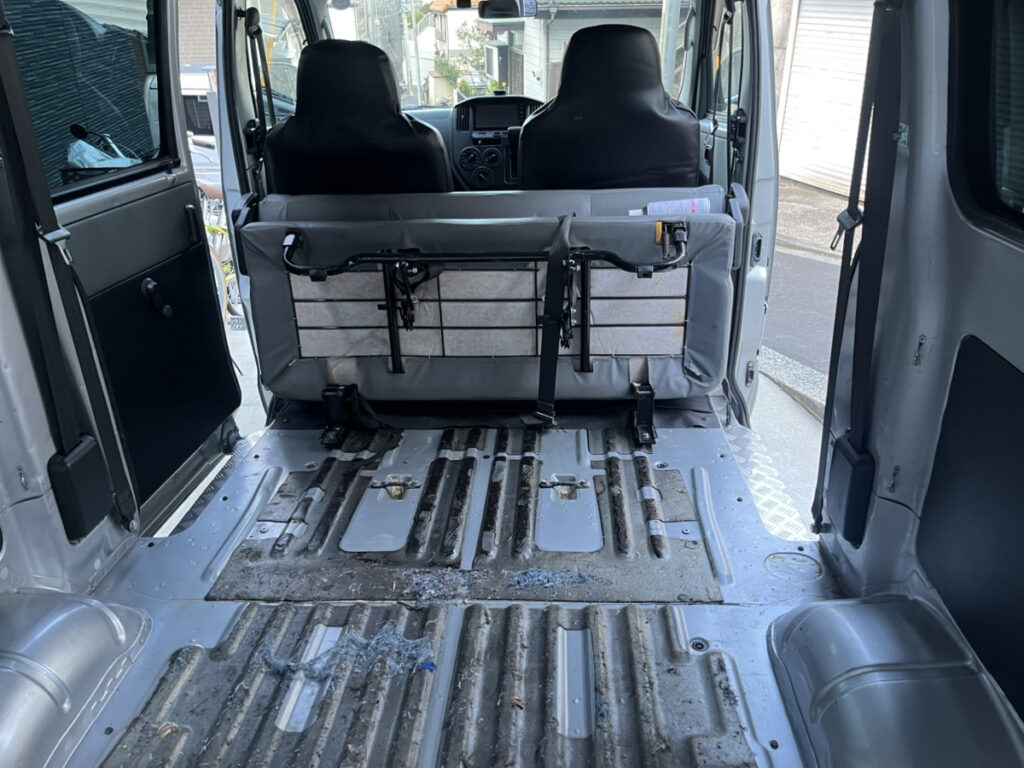 僕たちは外さないで作業を開始して後に外すことになるのですが、あらかじめ外しておいた方がだいぶ作業しやすいと思いますので、これは最初にやっておくべきでしょう。後部座席は4本のボルトで固定されているだけの簡単な作りなので、迷うことなく外せます。