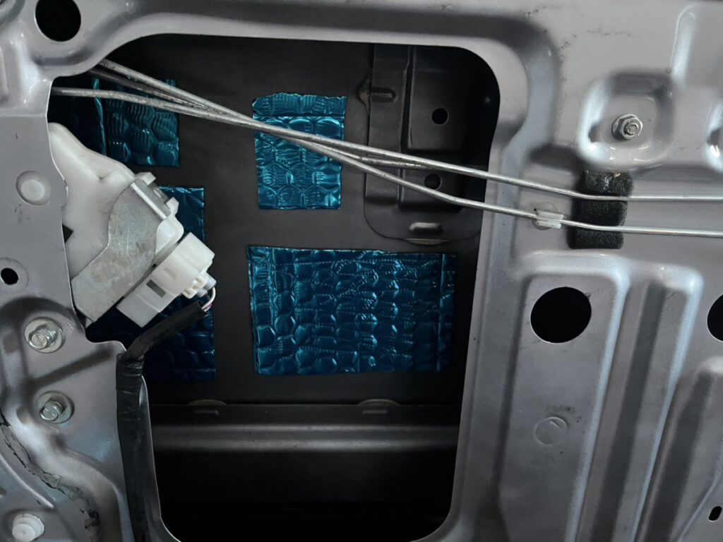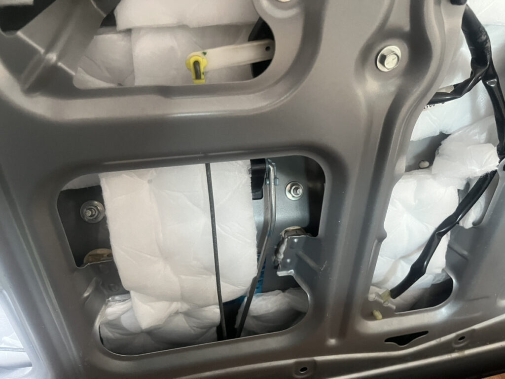 ドアの内側にあるメンテナンスホール(サービスホールカバー)は穴が小さいので、デッドニングシートは小さくカットして貼り付けました。断熱材は、厚みのあるアルミタイプではなく、綿タイプの吸音・断熱材を使用しました。
