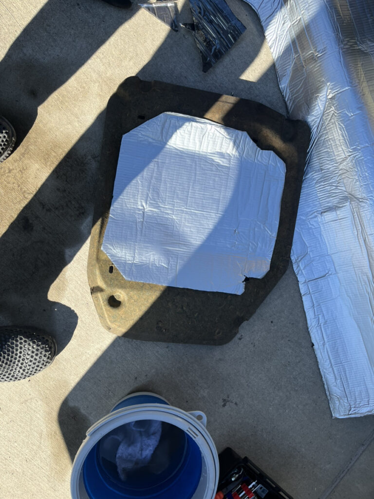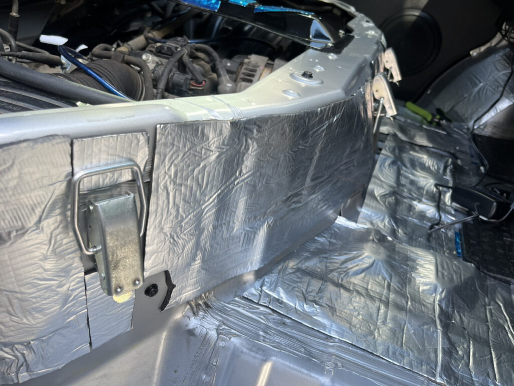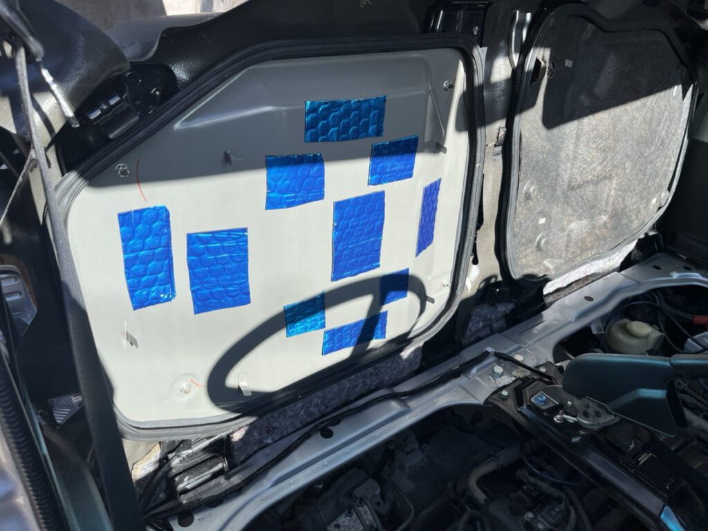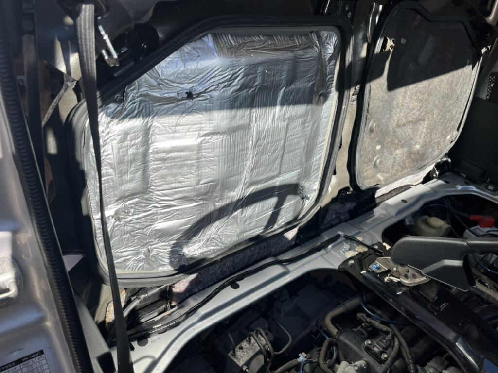 エンジンルームのカバーを外した内部です。ここはエンジンの熱がダイレクトに伝わるため、断熱が非常に重要です。吸音効果のある綿タイプの断熱材は避け、熱対策として、デッドニングシートの上からアルミタイプの断熱材を施工しました。
