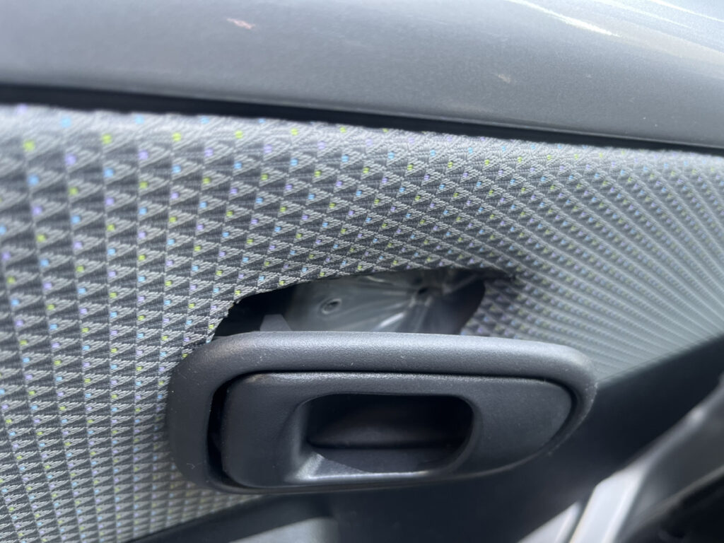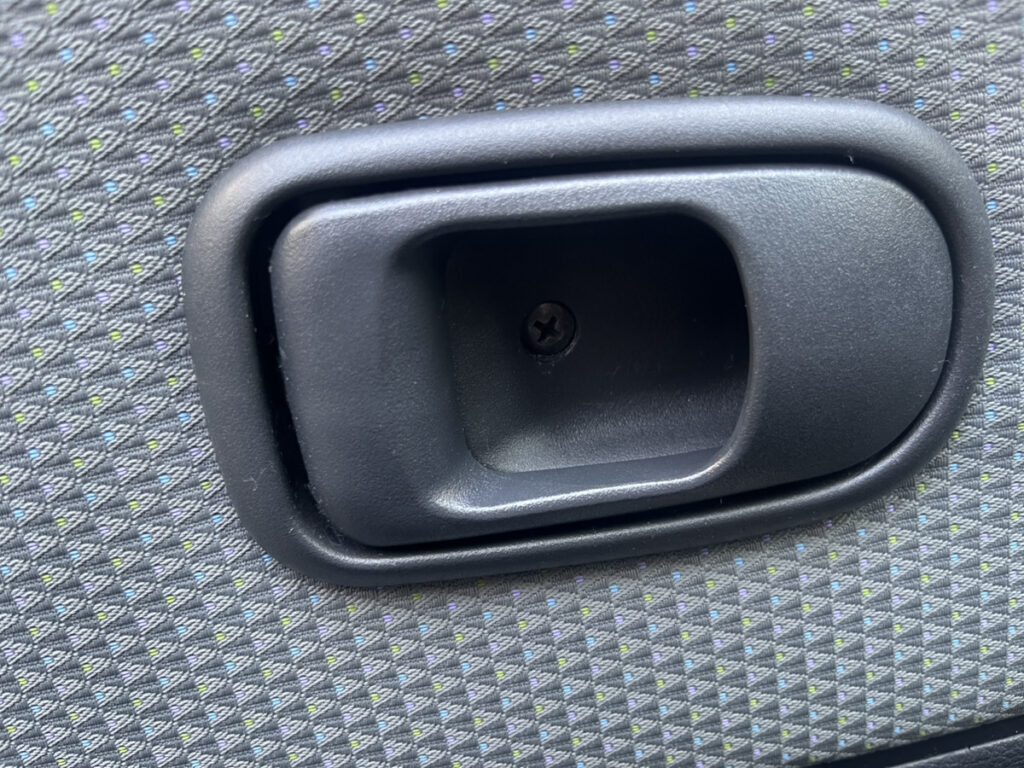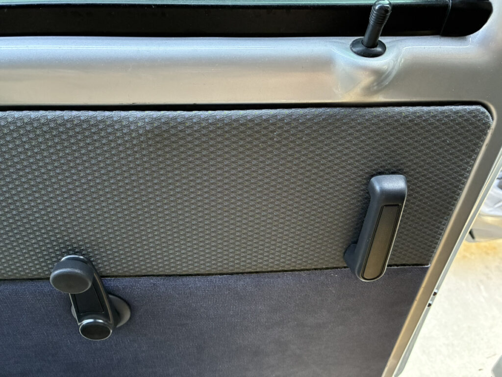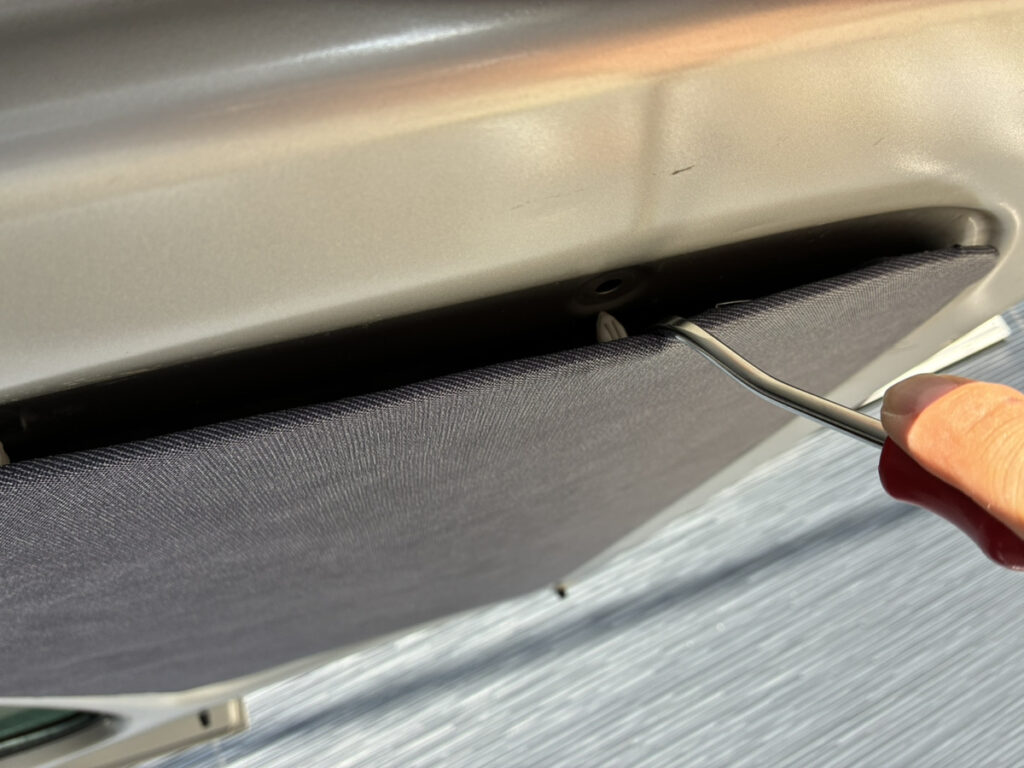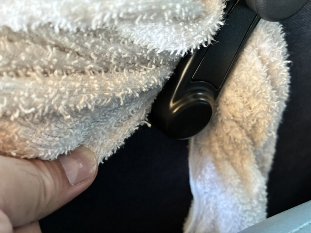 これを外すためには両方ともコツがいるのですが(前情報無しの初見じゃ絶対外せないのですが、、僕はYoutubeで見て知りました)隙間にタオルを差し込み、タオルを下に引くと、ピンが外れます。尚、開閉ハンドルはドアとのパネルの隙間。窓の回転ハンドルは丸いカバーとハンドルの間にタオルを入れます。