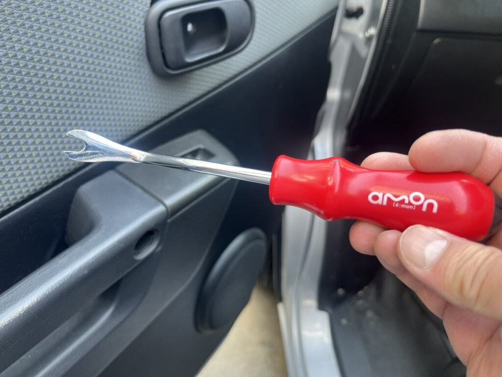 レバーとハンドルが外れたら、バックドア等と同様で内装はがしでパネルを取り外します。