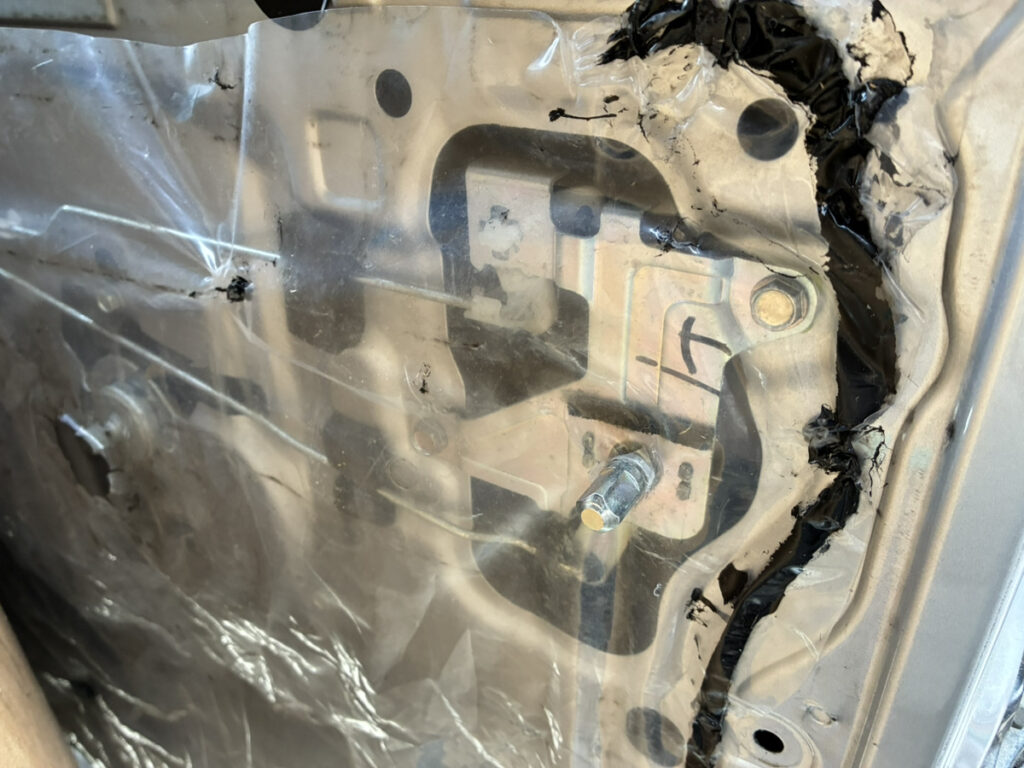 運転席・助手席ドア内側パネル・後部座席のサイドドア内側パネルを取り外すと、ビニールが出てくると思います。これは「サービスホールカバー」と言って防水・防音等のためについているそうですが、このビニールを一旦取り外します。